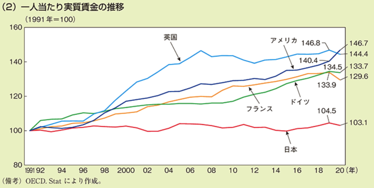 昨今では「賃上げ」「ベースアップ(ベア)」といったニュースも少なからず見られますが、それは大企業などごく一部の企業のみ。日本の平均年収は、バブル崩壊後ほとんど変わっていません。他の先進国が軒並み実質賃金を上げる中、ほぼ横ばいです。