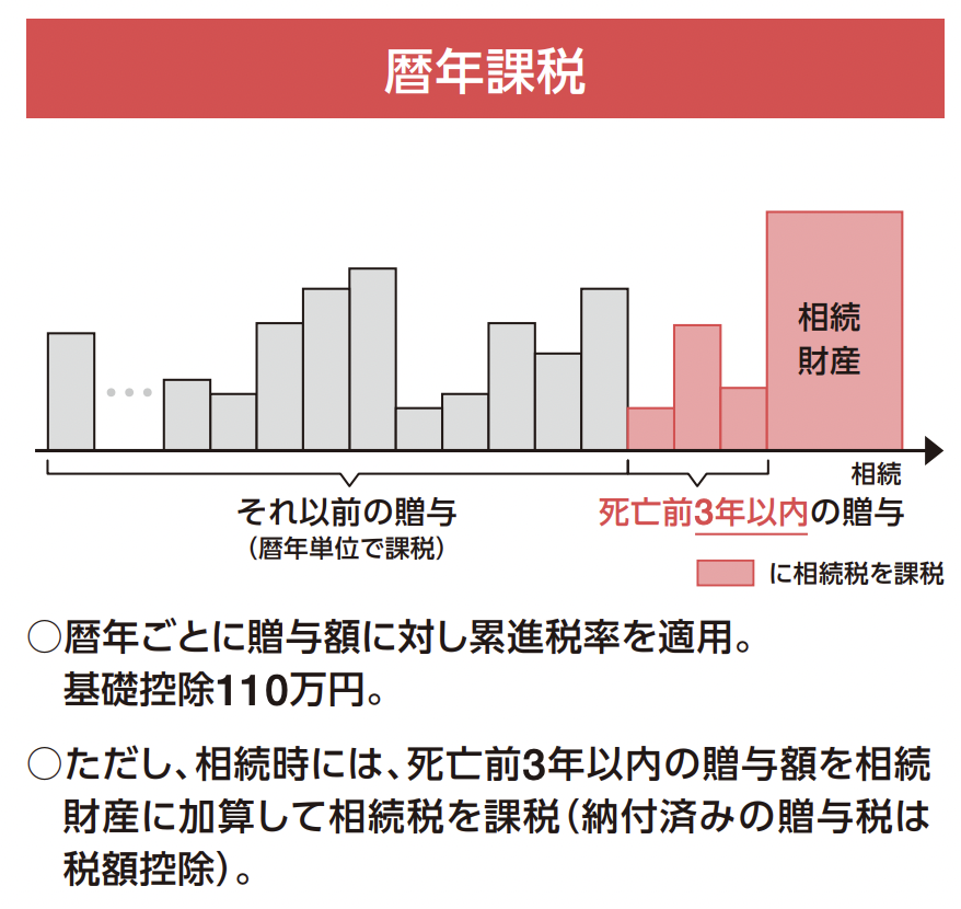 贈与税には、年間110万円の基礎控除があります。生前に複数年にわたって基礎控除ないで贈与していけば、相続税の節税になります。