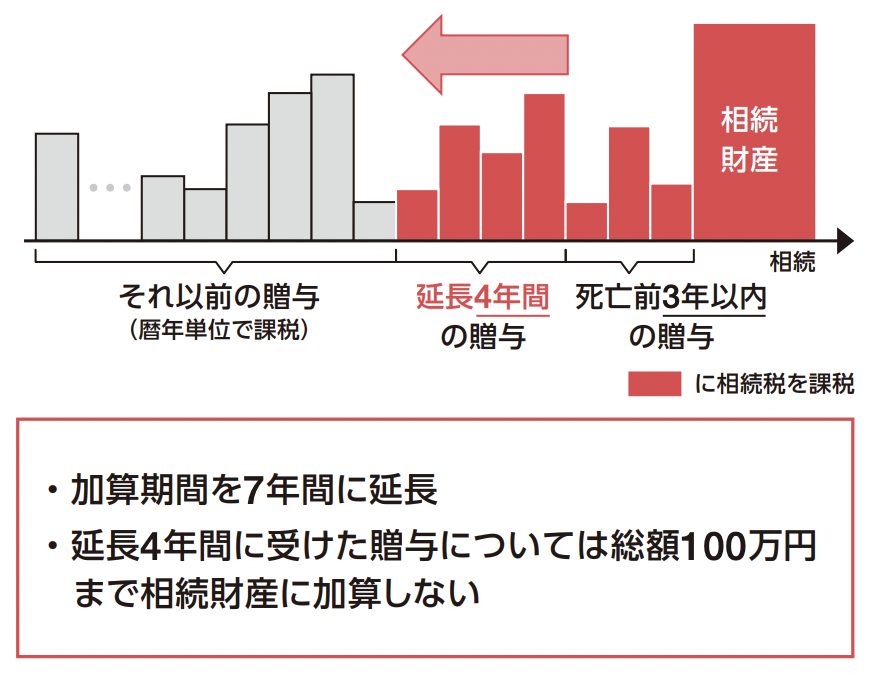現行制度では、相続税逃れを防ぐため、相続前3年以内の贈与額を相続財産に加算することとしていますが、税制改正により、2024年1月から加算する期間が7年に延長します。