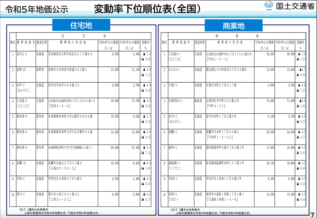 2023年公示地価では、コロナ禍からの回復傾向が見られました。しかし、全てのエリアで地価が上昇したわけではなく、逆に下落し続けているエリアもあります。