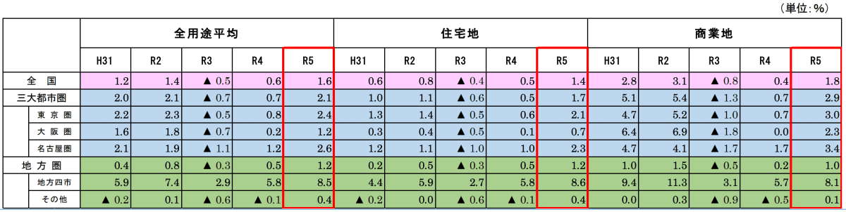 2023年1月1日時点の公示地価は、全用途平均で1.6%上昇しました。上昇は、2年連続のこと。コロナ禍で弱含みだった地価の回復傾向が顕著となっています。