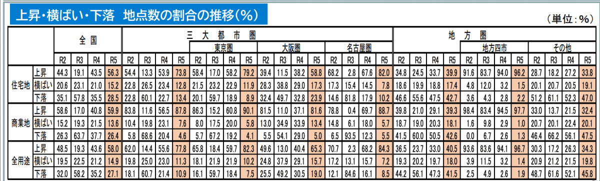 北海道に見られるように、各地ともに上昇したエリアもあれば横ばいや下落したエリアもあります。三大都市圏では、地価が上昇したエリアは7割を超えていますが、地方圏は4割。逆に、下落した地点の割合のほうが勝っています。