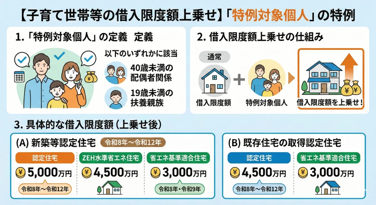 大綱では、いわゆる子育て世帯等に当たる「特例対象個人」について、借入限度額を上乗せできる枠を設けています。特例対象個人の定義も明記されています(40歳未満の配偶者関係、または19歳未満の扶養親族の有無)。