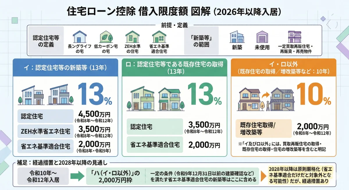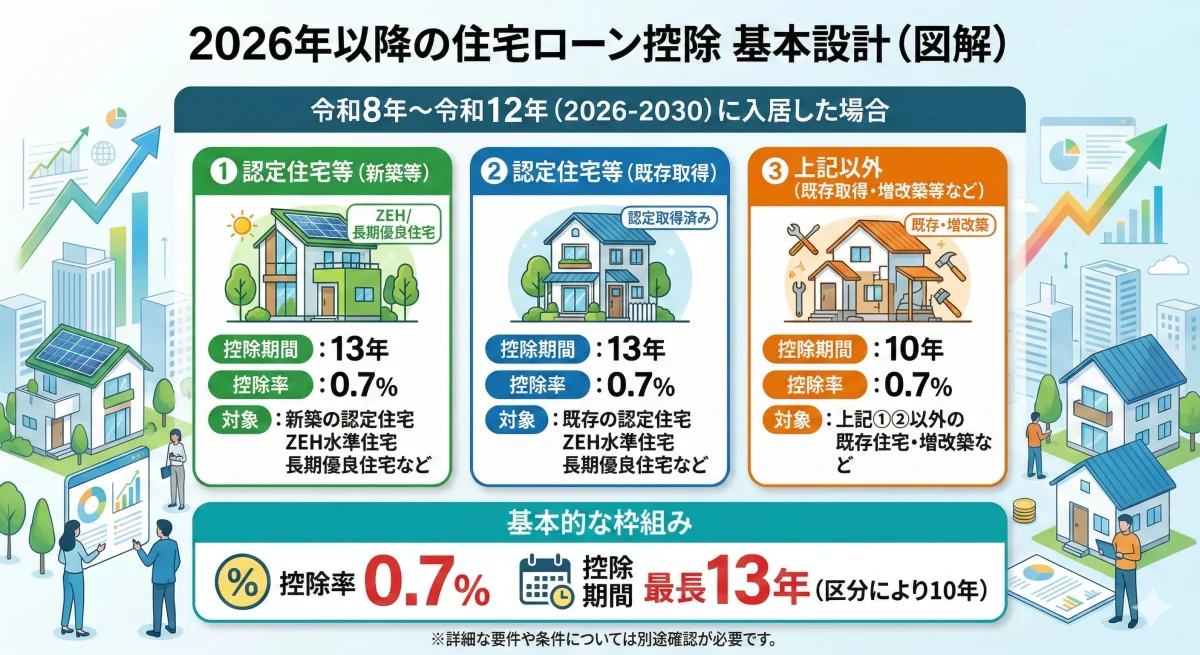 2026年以降の住宅ローン控除は、適用期限の延長に加え、対象となる住宅の区分ごとに“借入限度額・控除期間”が整理されています。まずは制度面の事実を、条文レベル(大綱記載)に沿って確認します。