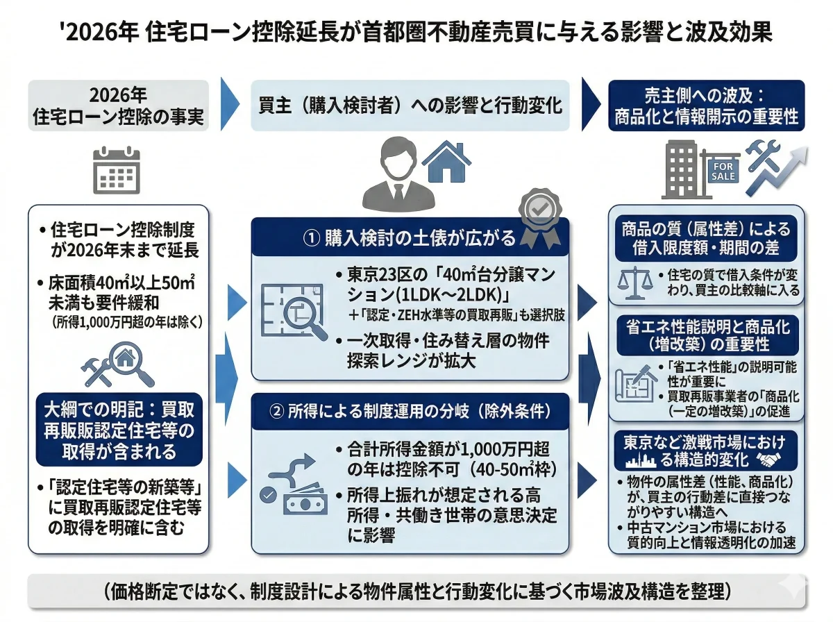 ここからは、上記の「制度の事実」が首都圏市場にどう効き得るかを、買主→売主(またはその逆)の波及構造で整理します。なお、市況(価格そのもの)を断定するのではなく、制度上“起こりやすい行動変化”として述べます。
