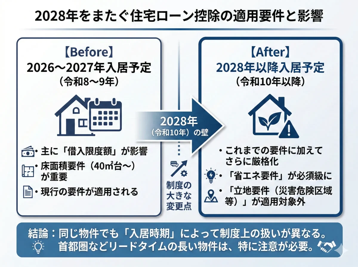 2026年(令和8年)時点の購入検討でも、入居が令和10年(2028年)以降にずれ込む場合、次の条件が効いてきます。