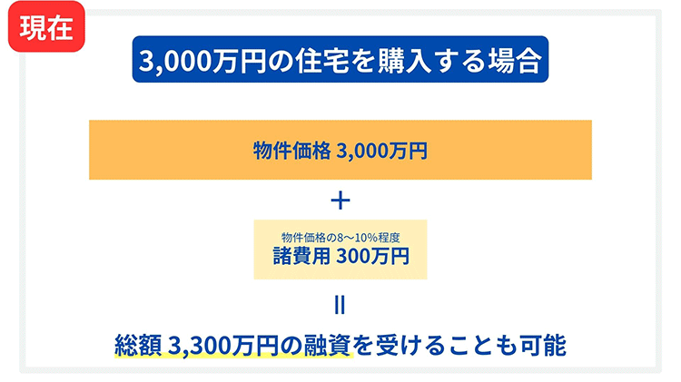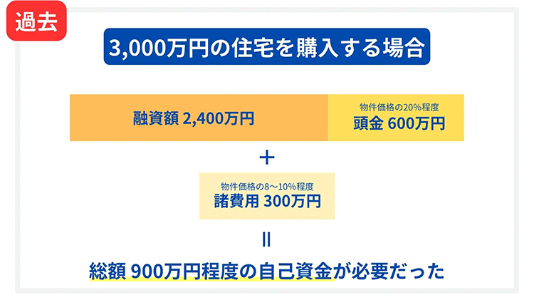 不動産の購入には、頭金のほか、物件価格の8〜10%程度の諸費用がかかります。つまり、一昔前は最低でも物件価格の30%ほどの自己資金が必要だったのです。