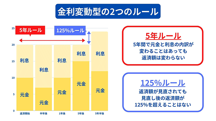 変動型の住宅ローンは、借入期間中、半年ごとに金利が変動するタイプを指します。変動型の住宅ローンの多くは「5年ルール」があり、半年ごとに金利が変わって利息と元金の割合が変わることはあっても、5年間は返済額は変わりません。また「125%ルール」により、返済額が見直されるタイミングも、従前の返済額の125%を上回ることのない仕組みになっています。ただし、ネット銀行など一部の金融機関にはこれらのルールがないため、注意が必要です。