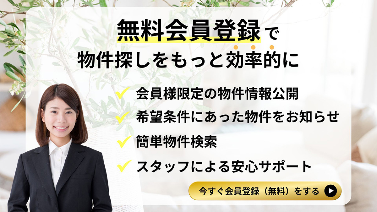 無料の会員登録をしていただくと「マイページ」をご利用いただけます。マイページをご利用いただくことで、より効率的に物件探しをしていただくことができます。強引な営業などはいたしませんので、安心してご利用ください。