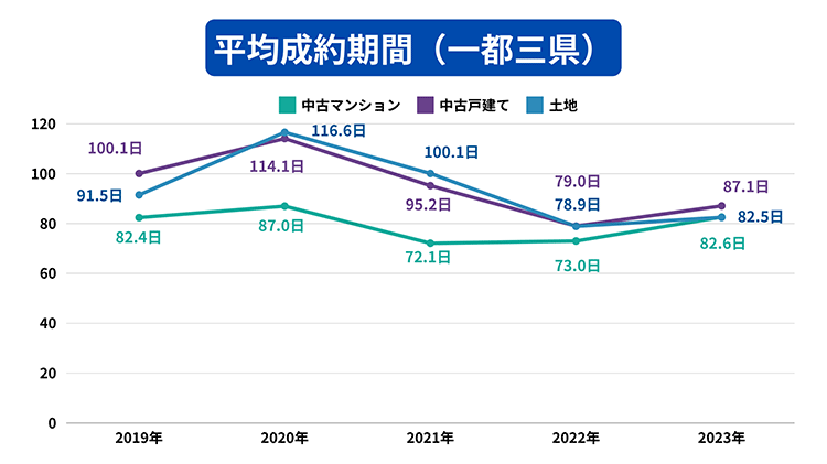 中古マンション・中古戸建て・土地の成約日数は、上記のように推移しています。成約までにかかる期間は物件の条件などによるため一概にはいえませんが、概ね3〜4ヶ月が相場といえるでしょう。基本的に、市況が良いと成約までの期間は短くなり、市況が悪いと長期化する傾向にあります。