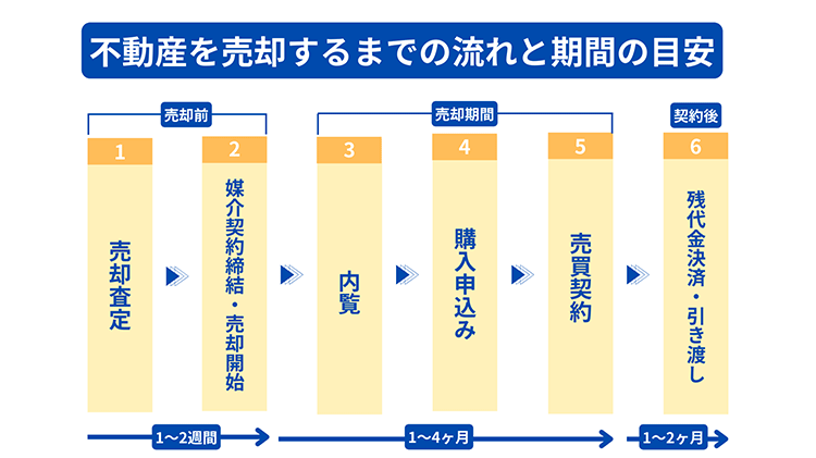 一方、売り出すまでには、査定を依頼したり、不動産を選定したりする期間も必要です。この期間は、1〜2週間程度を想定しておきましょう。