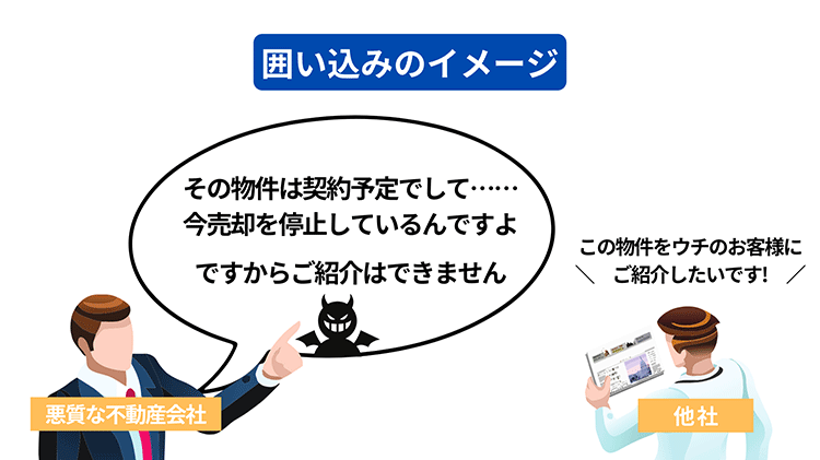 仮に販売元の不動産会社の顧客しか購入できないとなれば、購入検討者が絞られてしまうため売却に時間がかかり、金額も落ちてしまうことが予想されます。「囲い込み」をする不動産会社は、意図的にこのような状況を作ることで、自社の利益を高めます。