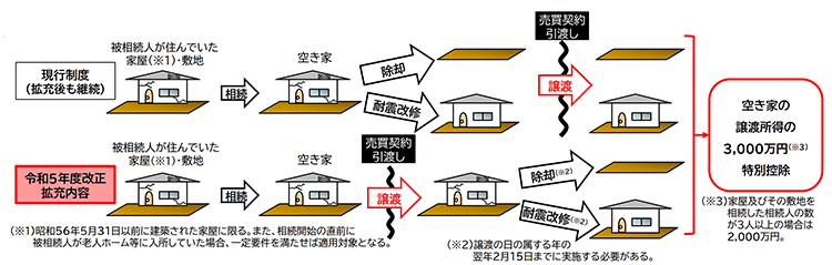 「2」「3」にあるように、同特例の適用を受けるには現行の耐震基準を満たす改修をするか家屋を解体する必要があります。「4」については、令和5年度税制改正で拡充された条件です。